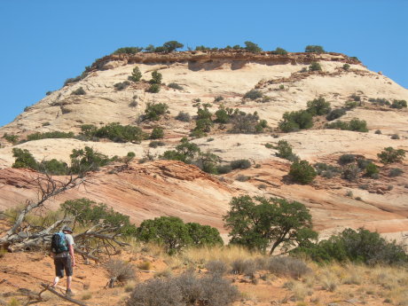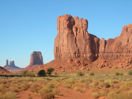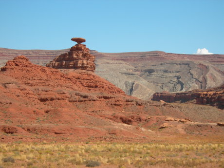Vanuit Page kom je al snel in Navajo-gebied, en daarna ook een stukje Hopi-gebied. Ook al hebben we serieus gesnoeid in onze doortocht bij de indianen, we hebben nog altijd heel wat kilometers af te malen. Maar het landschap maakt veel goed. Even voorbij de grens van Arizona met Utah komen we aan het Goosenecks State Park. Een uniek zicht op verschillende meanders van de Colorado. We stoppen ook aan Mexican Hat, een rots die zijn naam niet gestolen heeft.