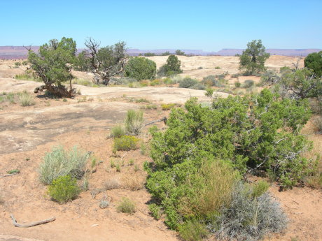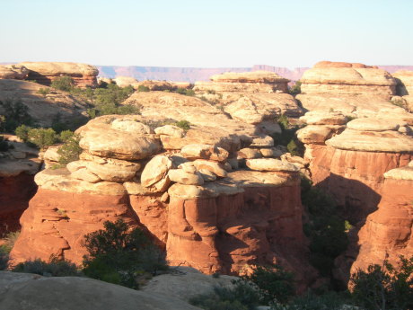 Even verder komen we aan de zuidelijke ingang van het Canyonlands National Park. Dit enorme park wordt voor het gemak opgedeeld in 3 delen: The Needles, The Maze, en Island in the Sky. Vandaag bezoeken we The Needles. In het Visitor Center krijgen we een voorstel van wat we er kunnen doen. Eerst doen we de Slickrock Trail, een korte wandeling van 3,4 km. Het lijkt wel een maanlandschap, met hier en daar kleine kraters, afgewisseld met perkjes waarop er door een andere ondergrond heel wat plantengroei staat.