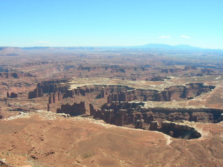 We bezoeken vandaag het noordelijke deel van het Canyonlands National Park. Je rijdt dit deel binnen over een smalle landengte, met aan de ene kant de afgrond van de Colorado-canyon, en aan de andere kant die van de Green River-canyon. Vandaar de naam Island in the Sky. We stappen eerst af aan Mesa Arch, waar het nogal druk is.