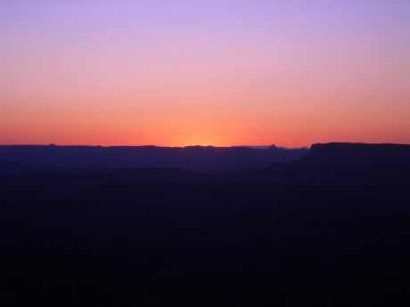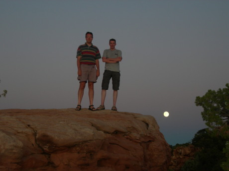 Daarna reppen we ons naar Needles Overlook, om er zeker vóór zonsondergang aan te komen. Dat lukt, en we kunnen nog enkele mooie plaatjes schieten van dit unieke uitzichtpunt op Canyonlands. De ondergaande zon en de opkomende maan bieden inspiratie voor nog meer foto’s.
