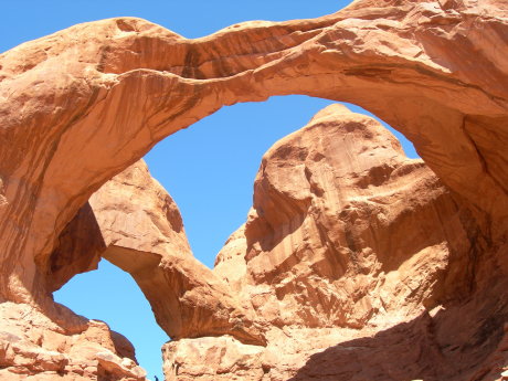 Na het uitchecken in Moab staan we snel aan de ingang van Arches National Park. Arches is een relatief klein park, met slechts 1 ingang. Het is er dan ook aanschuiven. Eens binnen in het park valt vooral de drukte op. Aan de uitkijkpunten is het telkens opnieuw zoeken naar een parkeerplaats. Na een kwartiertje stappen staan we onder Double Arch. Heel imposant, en onder die dubbelboog is er een heel goeie akoestiek.