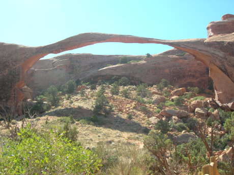 Omdat we te weinig tijd hebben, doen we niet de wandeling naar Delicate Arch. We bekijken ze vanop een uitkijkpunt. Een nederlander doet er stoeferig over z’n fototoestel en hoever hij daarmee wel kan inzoemen, en hoe hij die andere fotograaf met een enorme telelens in Yellowstone Park te kijk zette. In Devils Garden doen we nog de wandeling naar Landscape Arch (32 m hoog, 93 m lang).