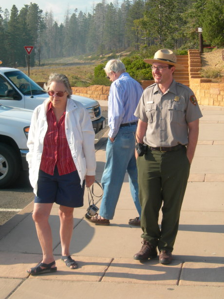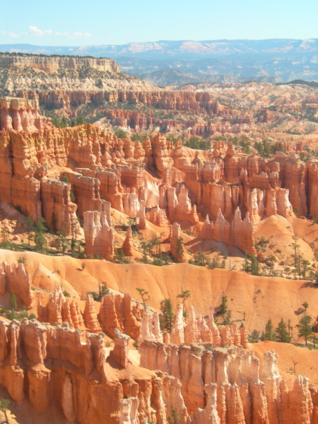 Een stevig ontbijt (spek met eieren) bij Clarke’s, die in dit slaperige dorp het monopolie heeft voor tanken, eten en inkopen. Aan de ingang van Bryce Canyon is het weer aanschuiven, gelukkig vinden we aan het Visitor Center snel een parkeerplaats, en kunnen we met shuttle bussen het park in. De vele bezoekers komen af op de vele prachtige rotspilaren in dit kalkplateau.