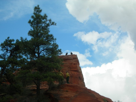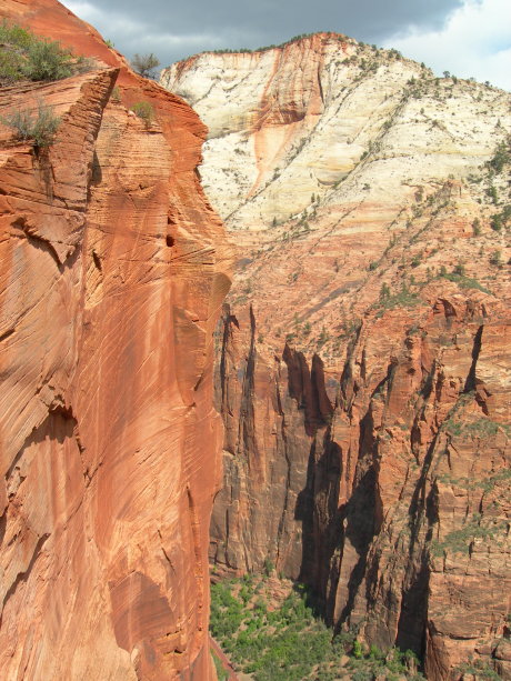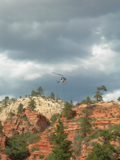 Vanaf Scouts Lookout stappen we nog wat verder richting Angel’s Landing. Dit pad loopt langs een steile afgrond, en er zijn kettingen bevestigd langs de wand om wat meer zekerheid te bieden. Na een tijdje beslissen we terug te keren, opdat Angel’s Landing niet zou uitdraaien op een fatale landing. Terug aan Scouts Lookout zijn medewerkers van het park bezig met het onderhoud van de paden. Een helikopter vliegt af en aan om rotsstenen te verwijderen.