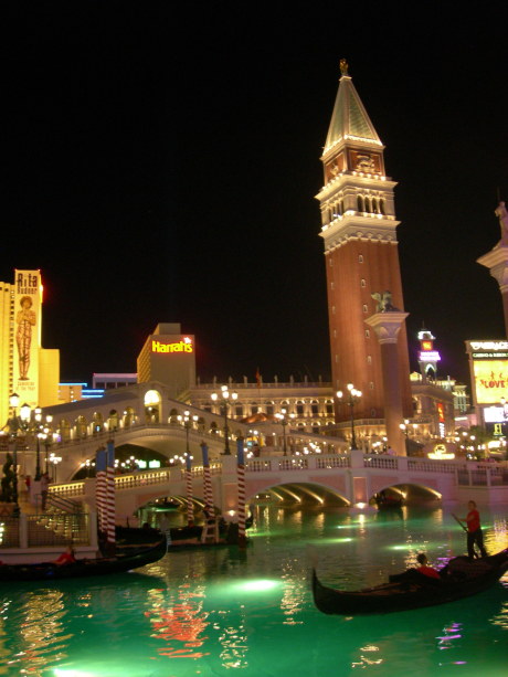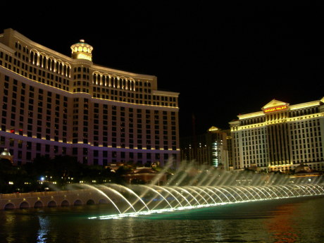 De Strip na zonsondergang is in niks te vergelijken met die overdag. We lopen langs de Bellagio, de Mirage, en de Venetian.